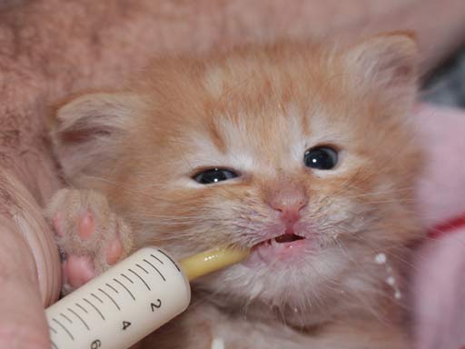 Als Charu twee weken oud is, groeit hij niet zo goed als zijn drie broertjes. Het is standaard dat de kittens in de eerste weken na hun geboorte zo'n 10% van het geboortegewicht aan moeten komen en dat houden we elke dag goed bij met een digitale keukenweegschaal. Charu lijkt last te hebben van zijn tepelkeuze en dat hij zich niet lang kan concentreren op zijn tepel. Zijn gewichtstoename loopt terug naar zo'n 6 à 5 gram per dag en we besluiten om hem te gaan bijvoeren met kittenmelk en een spuitje. In het begin kan hij zich ook hier niet zo goed op concentreren, zodat we hem een piepklein beetje druivensuiker geven, om een beetje op kracht te komen. Dat helpt en hij gaat lekker drinken. Hij komt nu wel aan, maar hij haalt nog steeds geen 100 gram per week, dus als Charu drie weken oud is, kopen we Convalesence bij de dierenarts en geven hem daar ook een beetje van, naast de gewone kittenmelk. En dat helpt echt goed! Charu komt behoorlijk aan in de weken hierna en wij zijn opgelucht!