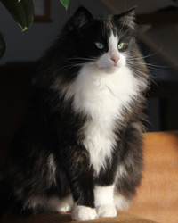als een bezetene vanaf kan rennen. Ze is op de dag van de lente 2008 voor het eerst krols geworden, dus ze is nu een "echte" poes. Ze is in de tussentijd wel even aan de pil geweest, tot aan begin juli 2008, want het kwam nog niet heel goed uit, dat ze een moederpoes zou worden. Maar nu is de tijd gekomen; we zijn op zoek gegaan naar een geschikte "lover" voor haar waar ze mee kan daten en we hopen dat daar dan mooie kleine noorse boskatjes uitkomen...