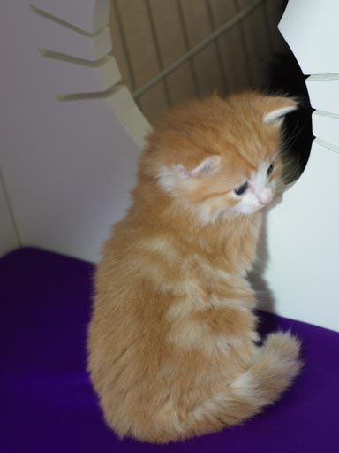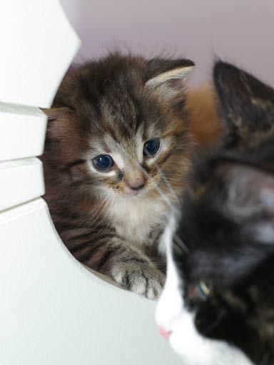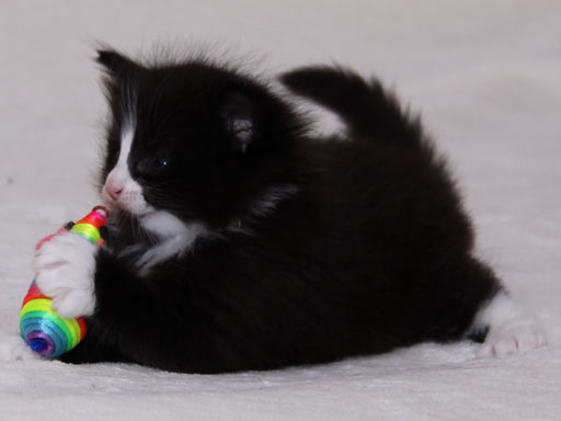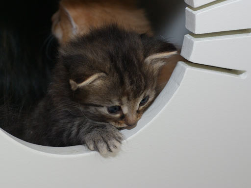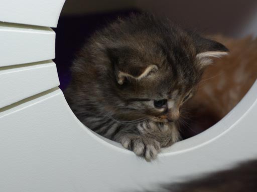 De kittens worden steeds leuker. Ze spelen heerlijk, kletsen wat en worden steeds mooier. Je zou haast verwachten dat dat niet meer mogelijk was, maar het blijkt van wel! De ren is flink uitgebreid, waardoor ze heel wat meer speelruimte hebben, en dat is met open armen ontvangen. Ook eten ze nu al flink wat blikvoer en dat gaat er in als koek. Behalve bij Alvyn, die eet liever droog, of - nog liever - bij mama! En dat terwijl Aydan en Aimi helemaal niet zo'n zin hebben in droge brokjes. Dat wordt nog wat... Afgelopen donderdag zijn ze allemaal voor het eerst op de bak gegaan en dat gaat prima. Ze weten hem goed te vinden en vooral ook te gebruiken. (pfft)