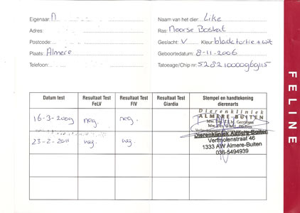 We hebben Like op 23 februari 2011 laten testen op GSD IV en op Fiv en Felv: