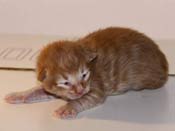 Het vierde kitten werd geboren om 9 voor half 1, op woensdag 6 juli. Ook hij is een red tabby katertje en lijkt op het eerste gezicht erg veel op zijn oudere broer. Toch zijn ze nu nog erg makkelijk uit elkaar te houden: red tabby nummer twee is een heel stuk zwaarder bij geboorte dan zijn broer, dus totdat we duidelijk verschillen in hun uiterlijk gaan zien, kunnen we het zo onthouden. Ook dit ventje is prachtig om te zien.