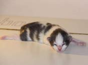 Het arme mannetje heeft nog geen uur mogen leven, hij zag er zo perfect uit. Alles erop en eraan. En ook zo mooi. Wat is het dan lastig om afscheid te moeten nemen! We waren alle vier erg ontdaan van dit kleine verlies. Zijn navelstreng was ook erg wit, heel raar van kleur. Heel zielig. Aimi was gelukkig al erg druk met haar andere twee kittens.